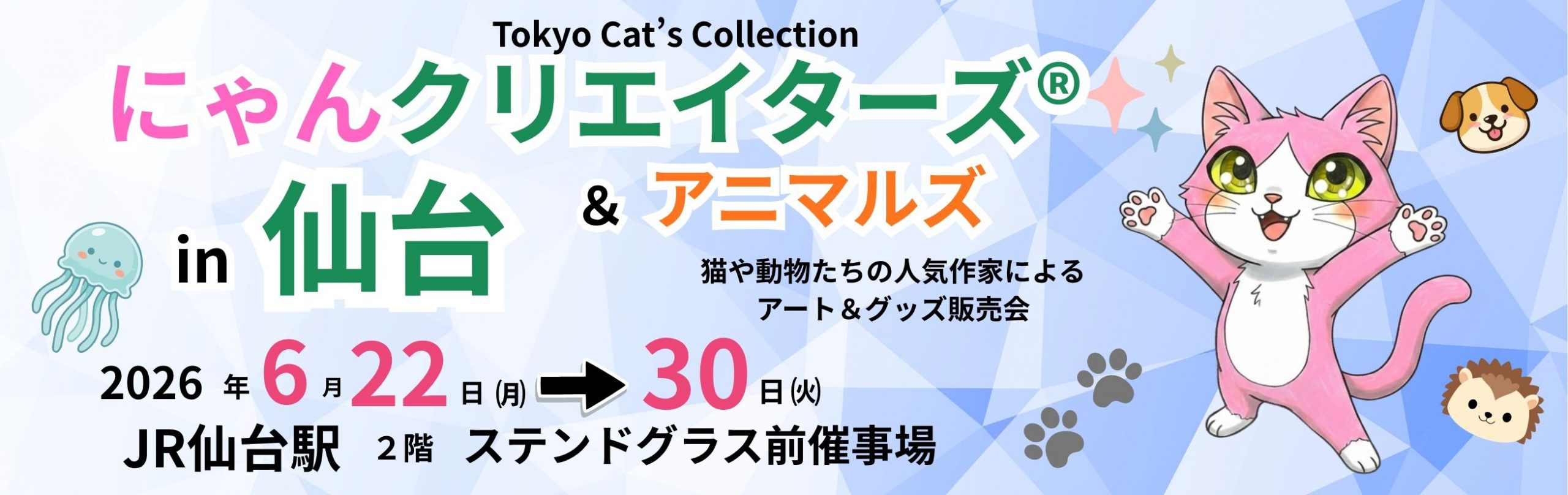 2025年8月1日 / 最終更新日時 : 2025年10月1日 wpmaster イベント 【終了】2025年9月1日(月)〜9日(火) にゃんクリエイターズ®in 仙台 JR仙台駅2F 東西通と「杜の陽だまりガレリア」 入場無料・駅直結・雨天OK! 🐾猫といきものアートが仙台駅に大集合!🐾 にゃんクリエイターズ&アニマルズ in 仙台 全国から猫好きクリエイターたちが集い、“猫と動物たち”をテーマにしたアート&雑貨が仙台駅にずらり! 人 […]