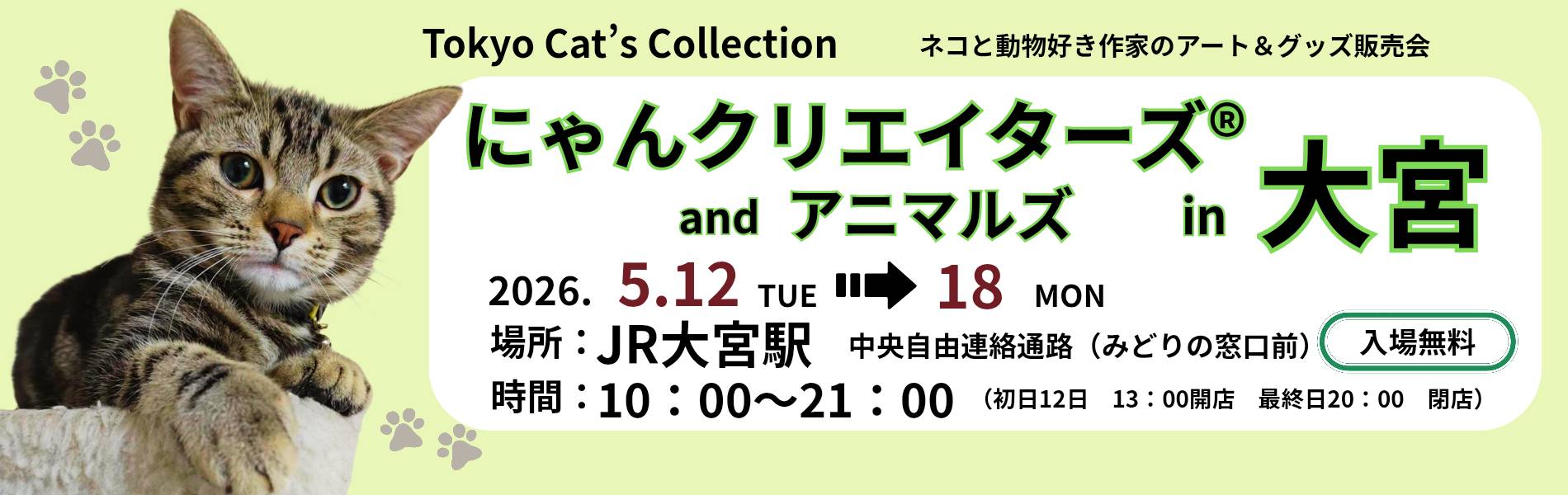 2026年4月12日 / 最終更新日時 : 2026年4月16日 wpmaster イベント 2026年5月12日(火)~18日(月)【入場無料】にゃんクリエイターズ®&アニマルズ in 大宮 JR大宮駅 中央自由連絡通路(みどりの窓口前) にゃんクリエイターズ&アニマルズ in 大宮 今年もJR大宮駅 中央通路のステージにて開催です。作家交替がありますのでチラシをご覧になって下さい。 夏の準備を始めませんか、衣類も充実、数々の作家作品をお楽しみ下さ […]
